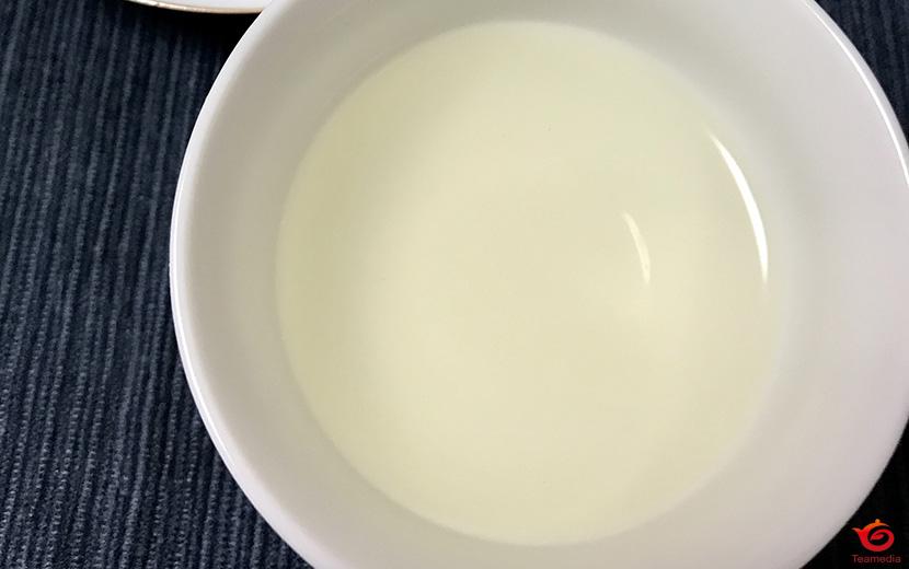 手を使わずに竹箒のようなものを使うのは、茶葉が繊細なので、それを壊さないようにするためだとか。上質な霍山黄芽をお皿に空けると、お皿に沢山の産毛が付いたりするので、やさしく取り扱われているのが分かるね。